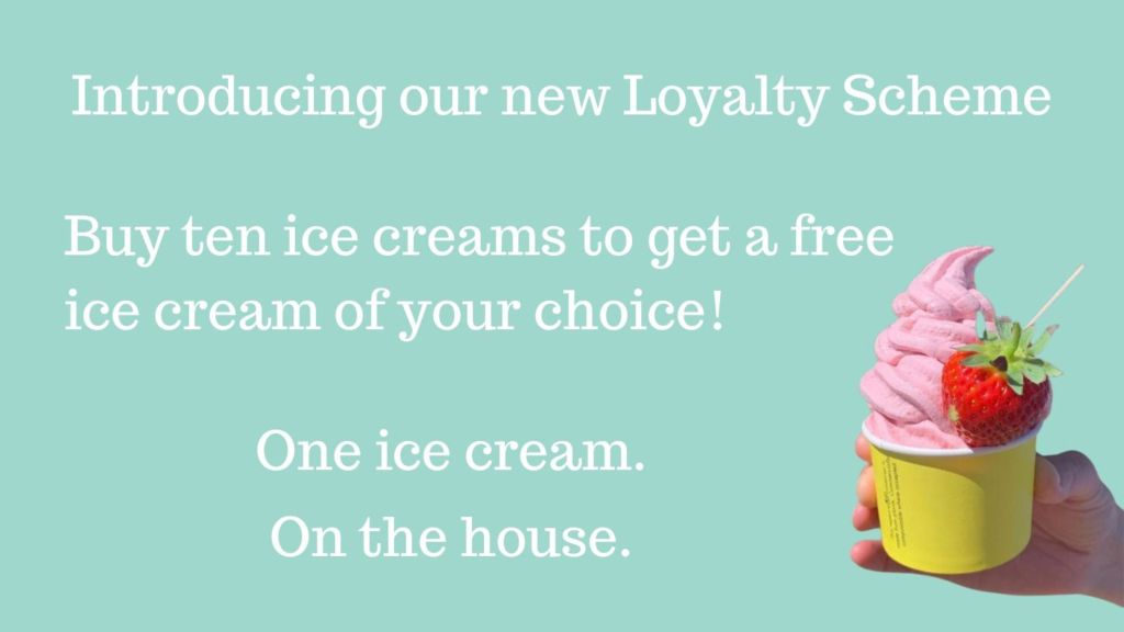 We’re gifting you one of our most popular products, to say ‘thank you’ for being a loyal customer. Simply pick up a Loyalty Card in our cafe and earn a stamp with every ice cream purchased. Collect ten stamps to claim your reward of an ice cream of your choice.