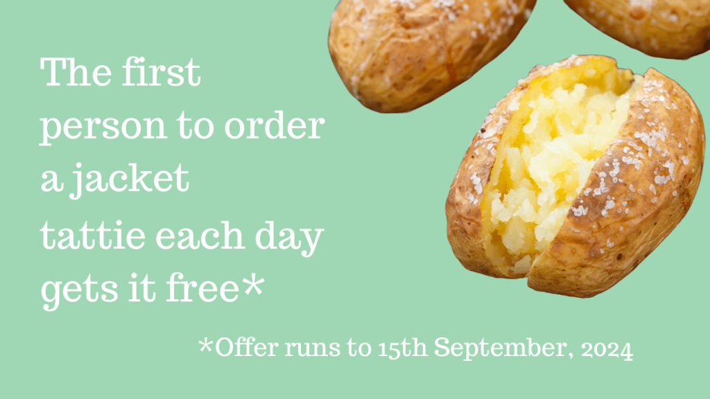 💫 The first person to order a jacket potato 🥔 each day between now and the end of the season on the 15th of September gets their potato 🥔 free.