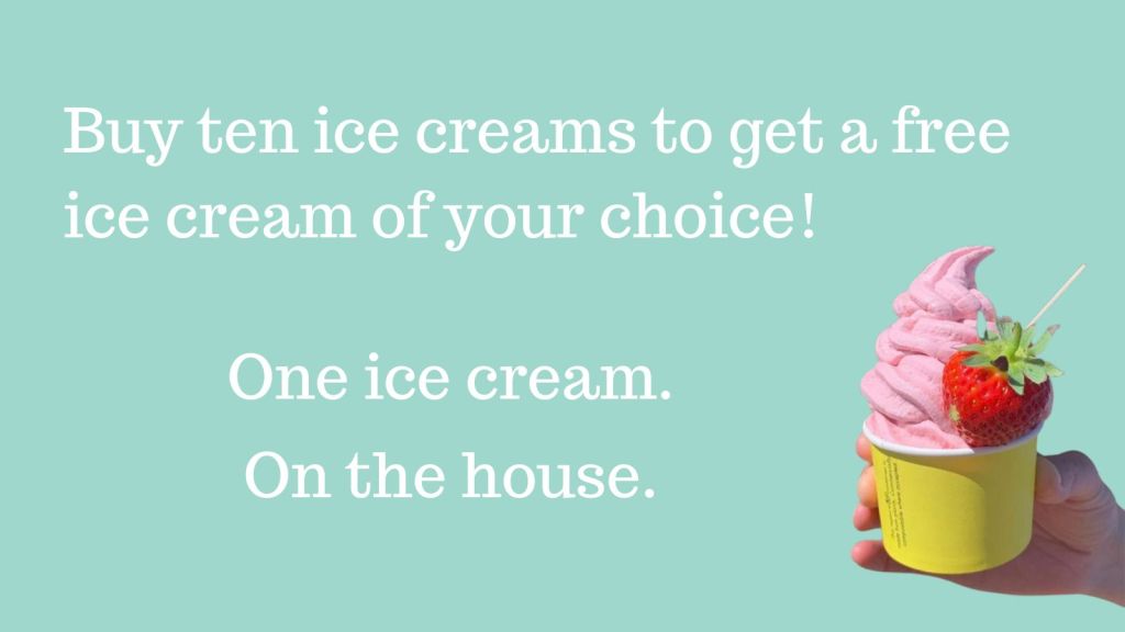 It’s simple really. Earn a stamp with every ice cream purchased. Collect ten stamps to claim your reward of an ice cream of your choice.